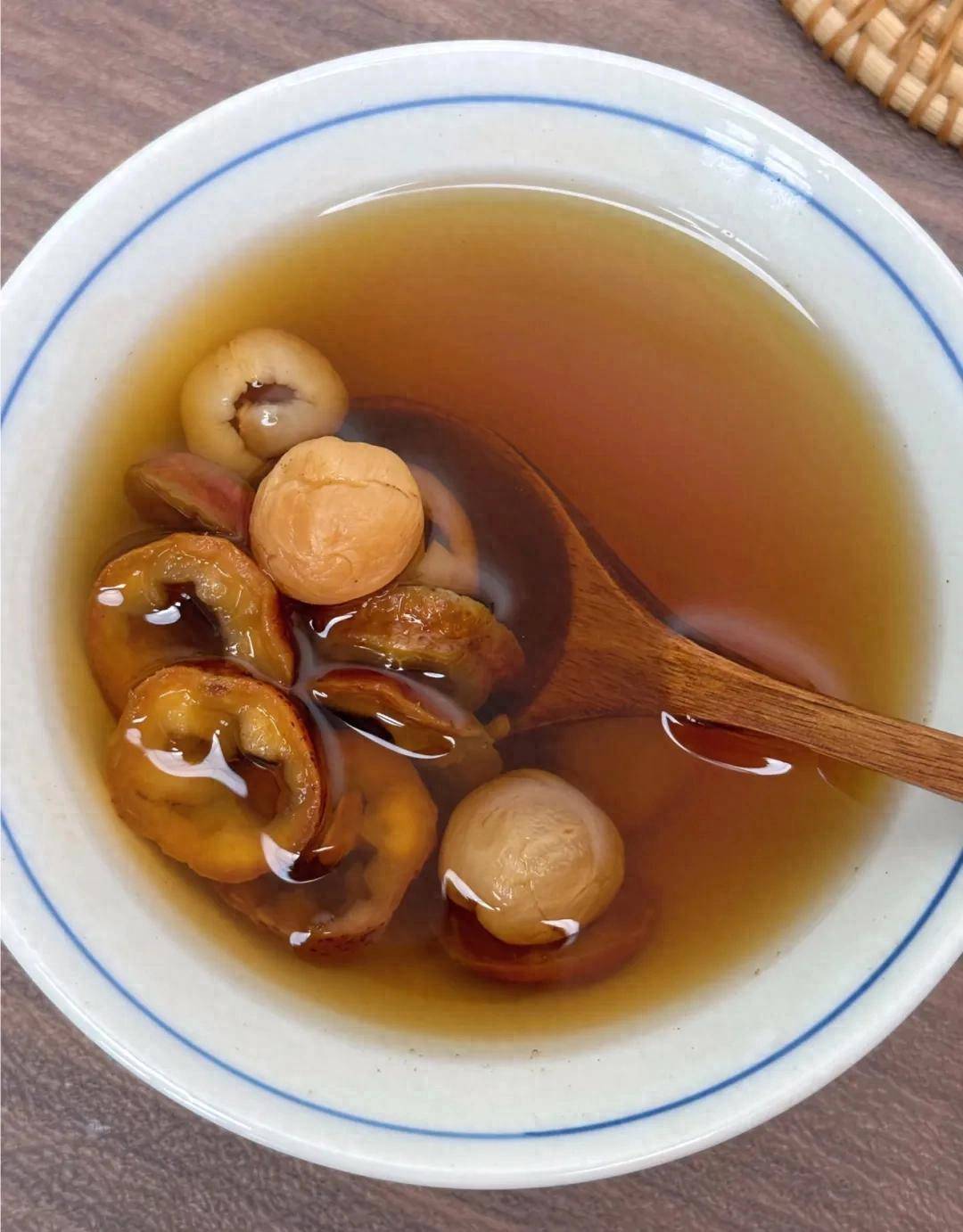 山楂大家都不陌生,行气化瘀、开胃消食是它的拿手好戏。全桂圆与山楂搭配,化瘀清“垃圾”的能力更强,而且二者搭配酸酸甜甜。中医认为酸甘化阴,补血养阴的功效也加倍啦!做法:取10颗干桂圆、10片干山楂,要是用新鲜山楂,2个就行。加入750毫升水,大火煮开后转小火,煮上20分钟即可。也能用养生壶煮,煮好后喝茶水就行,桂圆和山楂可不食用。