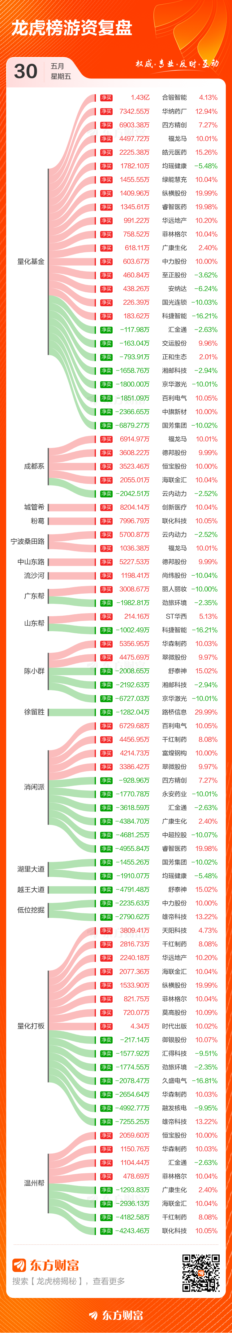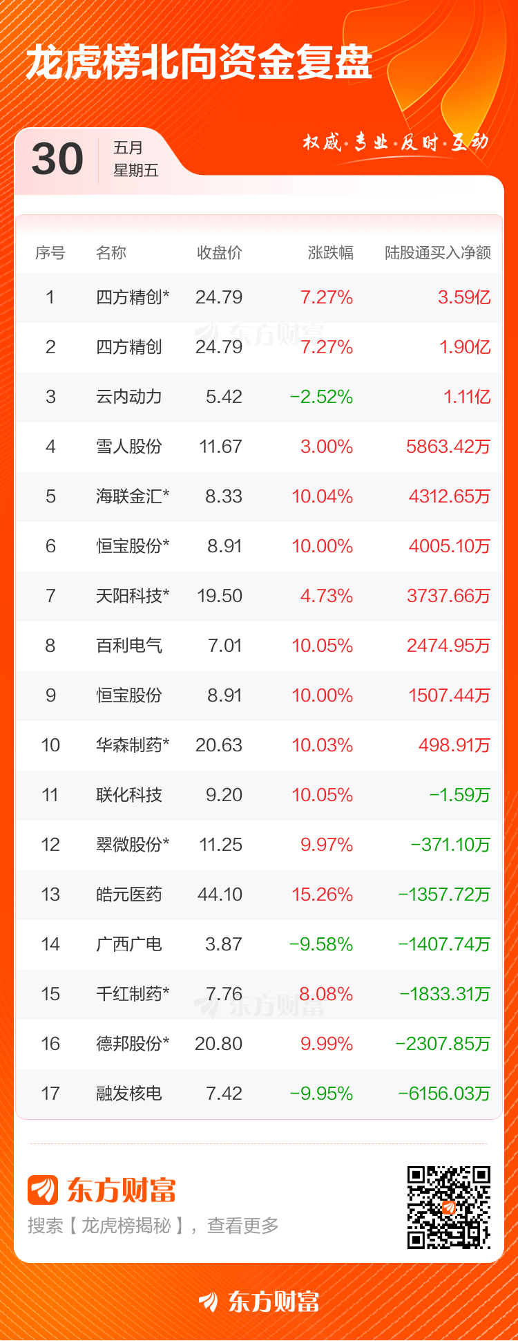 5月30日共有68只个股上榜龙虎榜宏盛证券宏盛证券,总上榜成交额143.48亿元。上榜个股中净买入额最高的是四方精创宏盛证券,金额为6.31亿元。